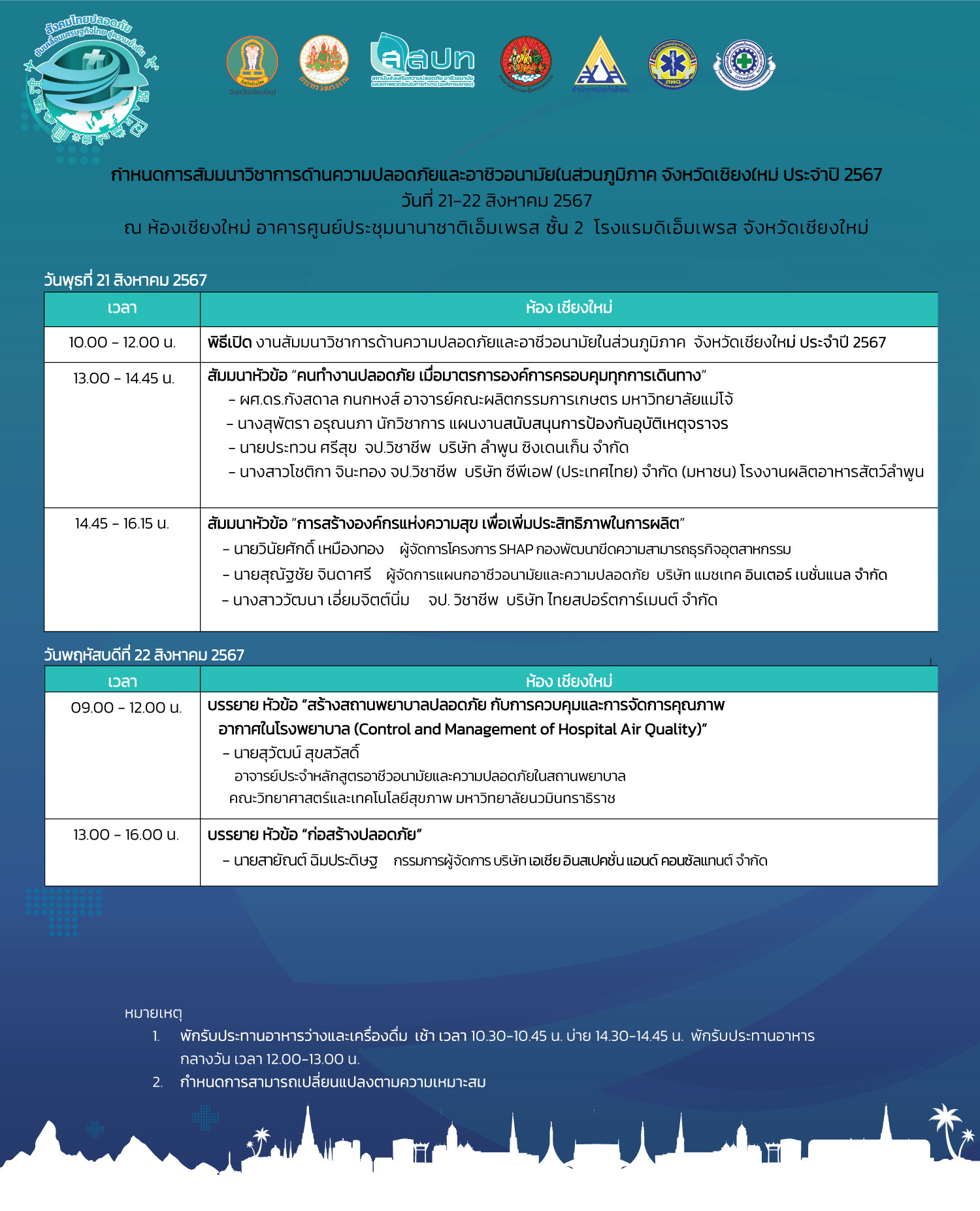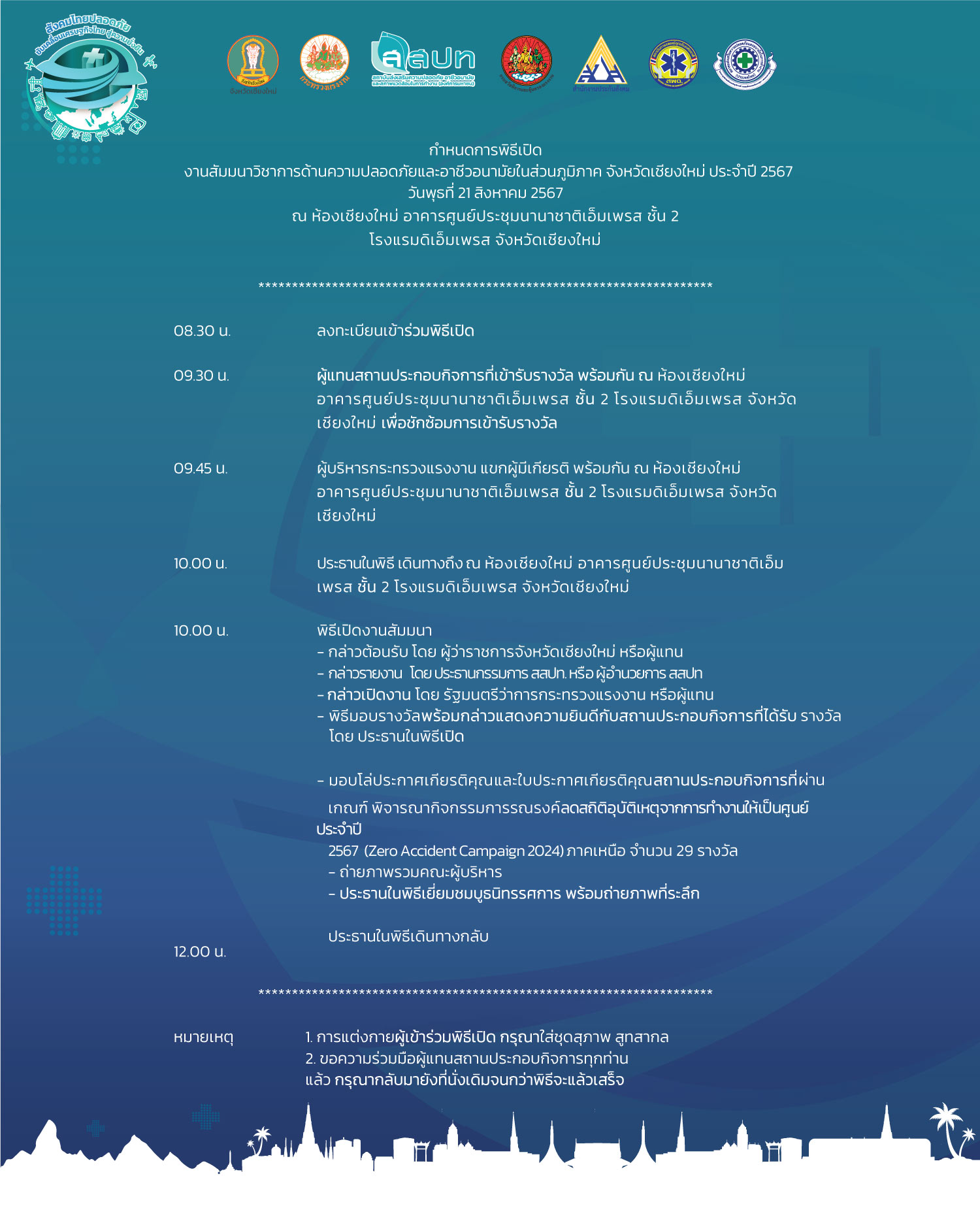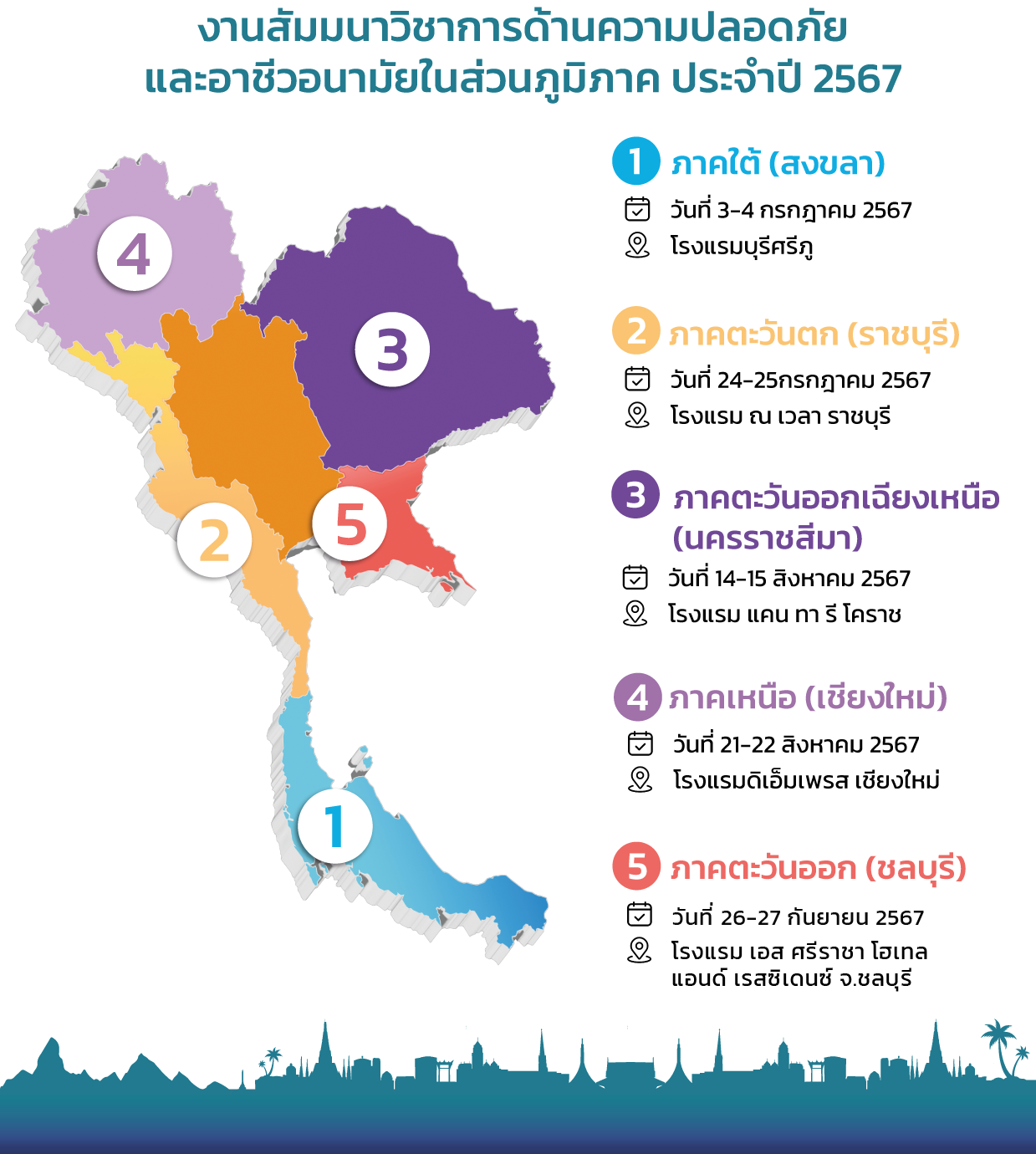 สถาบันส่งเสริมความปลอดภัย อาชีวอนามัย และสภาพแวดล้อมในการทำงาน (องค์การมหาชน) ร่วมกับภาคีเครือข่ายด้านความปลอดภัย กำหนดจัดงานสัมมนาวิชาการด้านความปลอดภัยและอาชีวอนามัยในส่วนภูมิภาค ประจำปีงบประมาณ 2567 จำนวน 5 ภาค เพื่อให้นายจ้าง ลูกจ้าง ผู้ที่เกี่ยวข้องทั้งภาครัฐ และภาคเอกชน ตระหนักถึงความสำคัญในเรื่องความปลอดภัย อาชีวอนามัย และสภาพแวดล้อมในการทำงาน รวมทั้งเพื่อพัฒนาศักยภาพบุคลากรด้านความปลอดภัยในการทำงานของสถานประกอบกิจการ ภายใต้แนวคิด ร่วมสร้างวัฒนธรรมไทยเชิงป้องกัน สู่ความปลอดภัย อาชีวอนามัย และความผาสุกที่ยั่งยืน (Forward Culture of Prevention for Safety Thailand) โดยงานดังกล่าวจัดให้มีการสัมมนาวิชาการ การแสดงนิทรรศการจากภาครัฐและเอกชน กิจกรรมแลกเปลี่ยนเรียนรู้ด้านความปลอดภัย เพื่อเสริมสร้างการพัฒนาองค์ความรู้และประสบการณ์ทางวิชาการให้กับผู้เข้าร่วมงาน