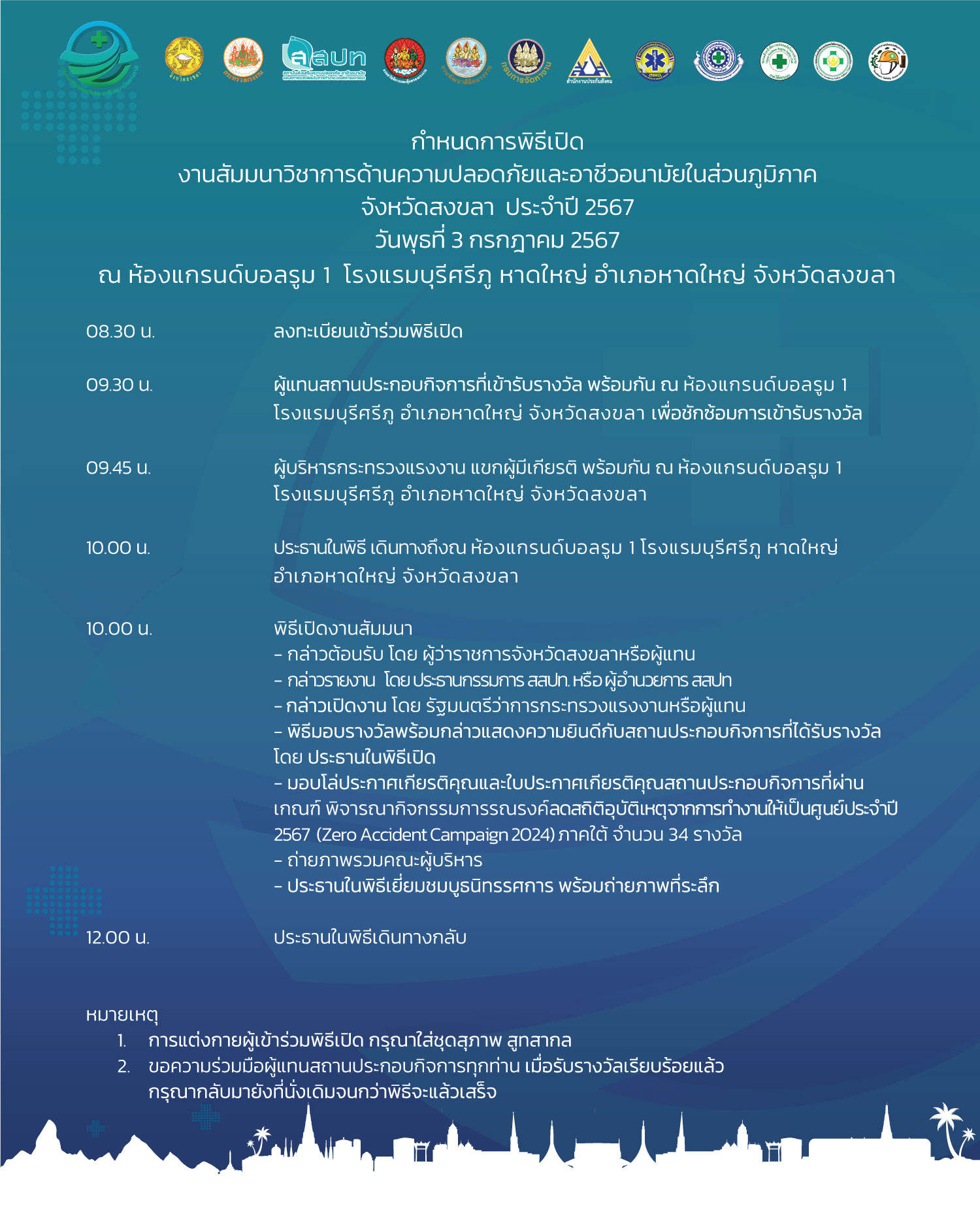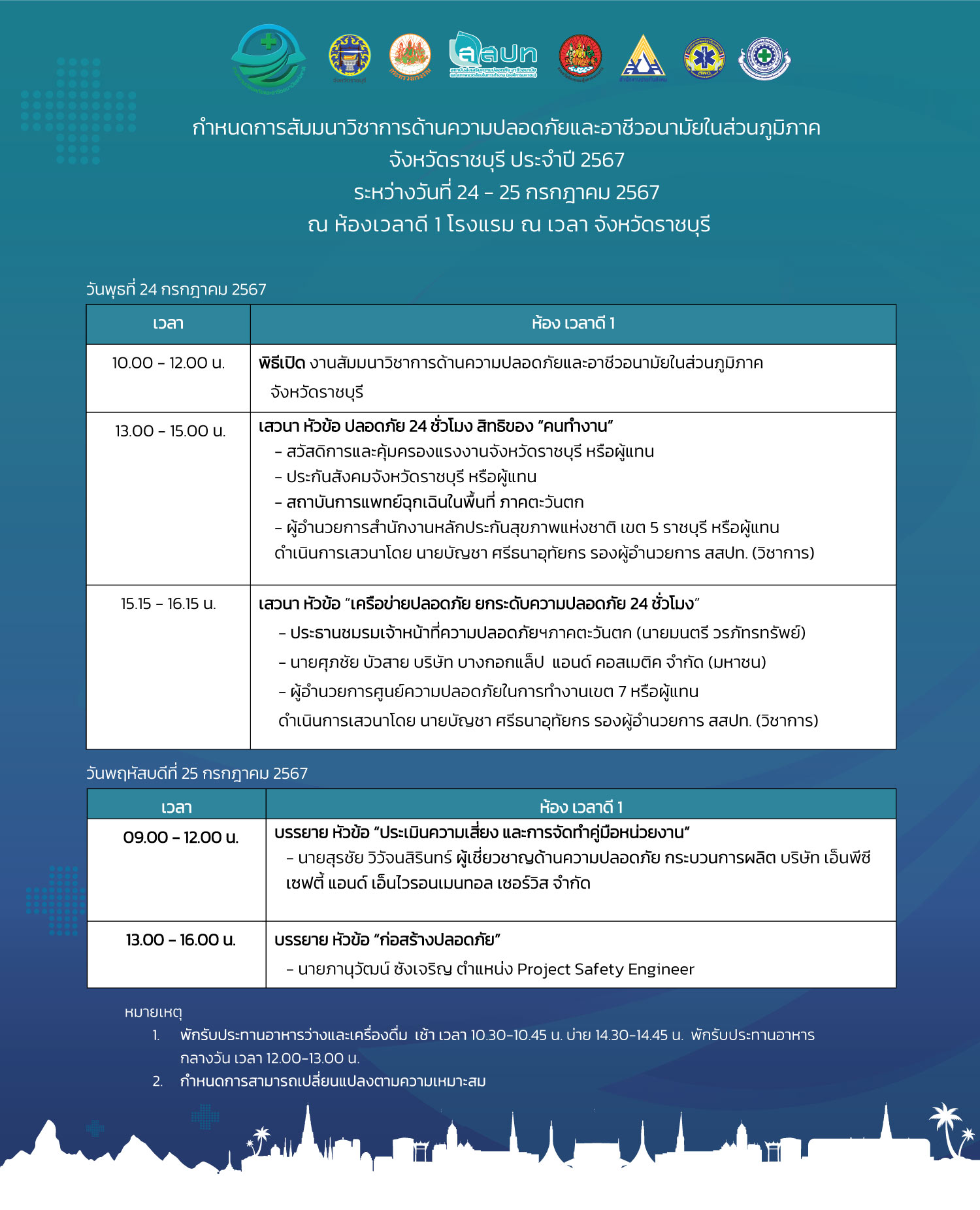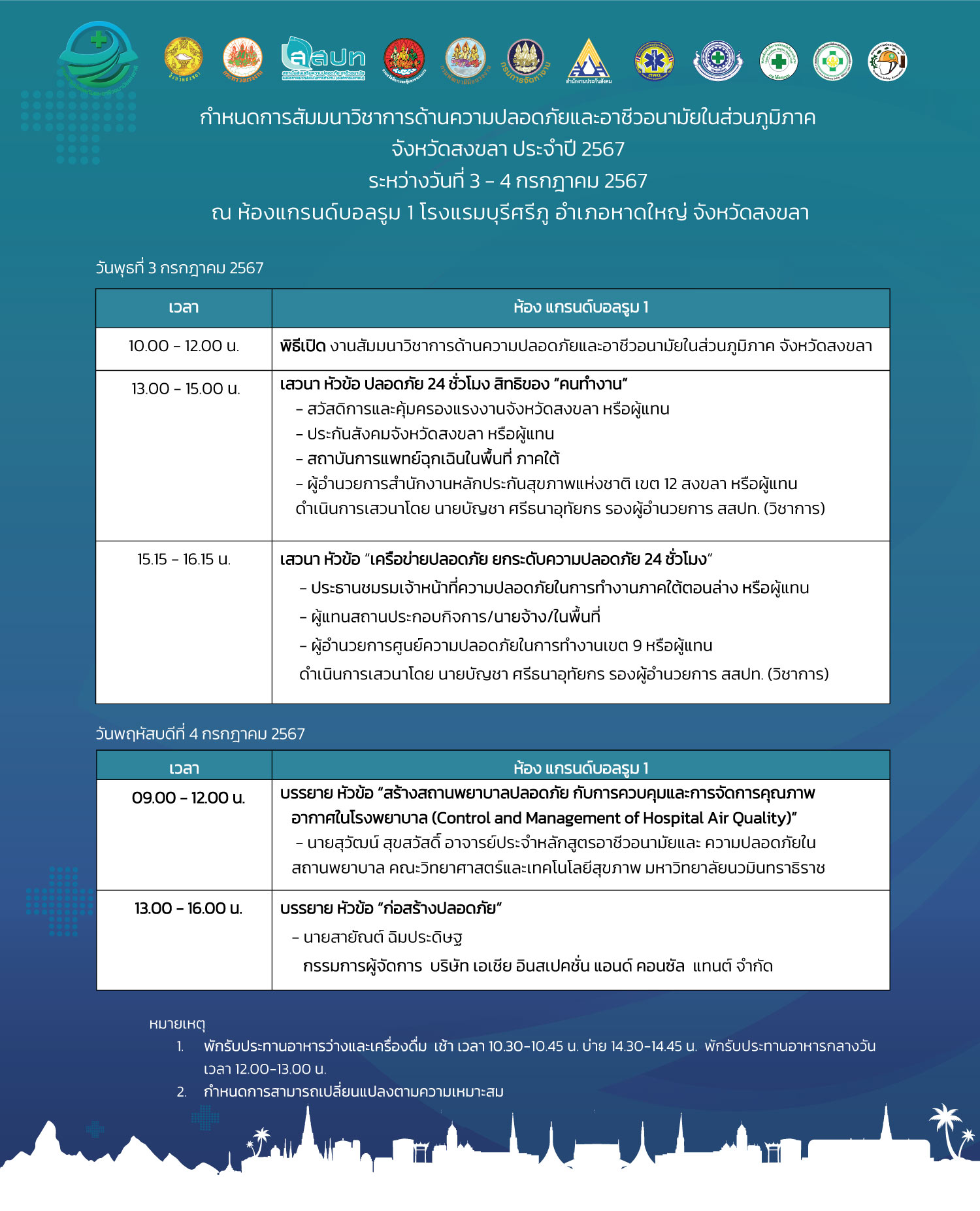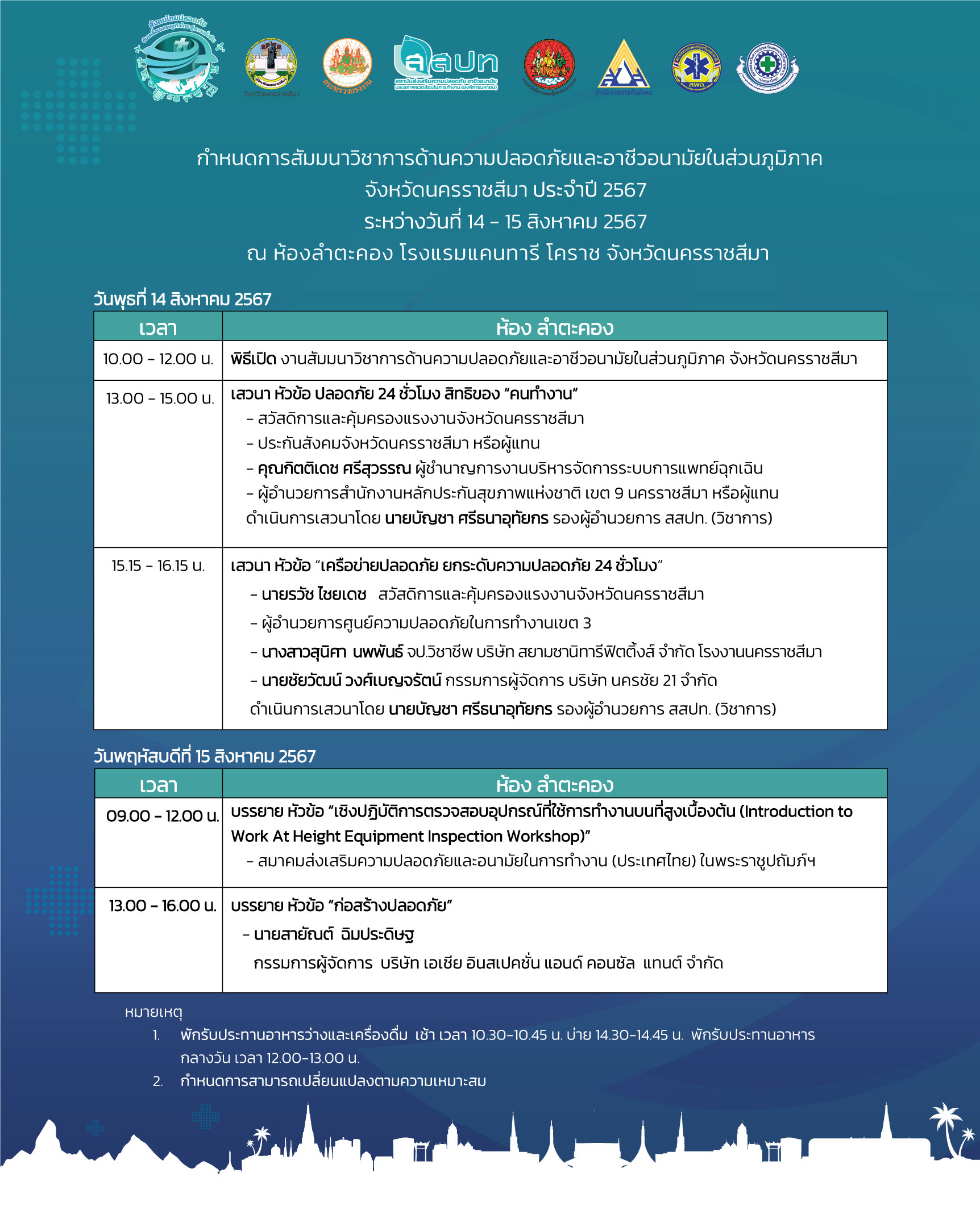 สถาบันส่งเสริมความปลอดภัย อาชีวอนามัย และสภาพแวดล้อมในการทำงาน (องค์การมหาชน) ร่วมกับภาคีเครือข่ายด้านความปลอดภัย กำหนดจัดงานสัมมนาวิชาการด้านความปลอดภัยและอาชีวอนามัยในส่วนภูมิภาค ประจำปีงบประมาณ 2567 จำนวน 5 ภาค เพื่อให้นายจ้าง ลูกจ้าง ผู้ที่เกี่ยวข้องทั้งภาครัฐ และภาคเอกชน ตระหนักถึงความสำคัญในเรื่องความปลอดภัย อาชีวอนามัย และสภาพแวดล้อมในการทำงาน รวมทั้งเพื่อพัฒนาศักยภาพบุคลากรด้านความปลอดภัยในการทำงานของสถานประกอบกิจการ ภายใต้แนวคิด ร่วมสร้างวัฒนธรรมไทยเชิงป้องกัน สู่ความปลอดภัย อาชีวอนามัย และความผาสุกที่ยั่งยืน (Forward Culture of Prevention for Safety Thailand) โดยงานดังกล่าวจัดให้มีการสัมมนาวิชาการ การแสดงนิทรรศการจากภาครัฐและเอกชน กิจกรรมแลกเปลี่ยนเรียนรู้ด้านความปลอดภัย เพื่อเสริมสร้างการพัฒนาองค์ความรู้และประสบการณ์ทางวิชาการให้กับผู้เข้าร่วมงาน
