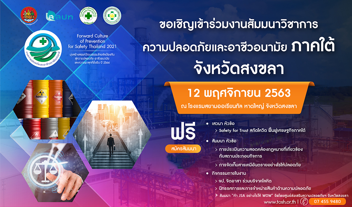 งานสัมมนาออนไลน์ด้านความปลอดภัยและอาชีวอนามัย (ภาคใต้) ประจำปี 2565 รายละเอียด เผยแพร่เมื่อ: วันอังคาร, 19 ตุลาคม 2564 16:34 ฮิต: 5414